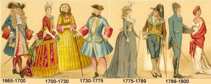 - Барокко и Рококо (XVII-XVIII вв.). Костюм: костюмы отличаются помпезностью и театральностью. Используются объёмные юбки-кринолины, многослойные платья, широкие рукава, рюшечки. бантики и оборочки. Популярны атлас, тафта, муаровое плетение. Мужской костюм: рубашки с длинными кружевными манжетами, камзол без рукавов с расшитым поясом-шарфом, жюстокор – длинный кафтан с рукавами. Женский костюм: платья с двойными объёмными юбками (верхней, более тёмной, и «выглядывающей» из-под неё нижней, непременно светлой). Аксессуары: вышивка драгоценными камнями, плиссировка, банты, каскады лент.