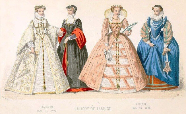 - Эпоха Возрождения (XIV-XVI вв.). Костюм: появляются роскошные наряды с богатой отделкой золотом, серебром, жемчугом и дорогими тканями (парча, шёлк). Распространяется вышивка стразами, шнуровка, пышные рукава и воротники.